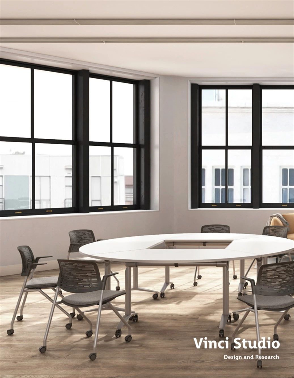 VEB桌椅以合理利用空間為設(shè)計要素。通過市場調(diào)研發(fā)現(xiàn),由于會議的規(guī)模大小和參與的人數(shù)不同,有時候會出現(xiàn)空間和人員的不合理分配。針對用戶的痛點分析,可折疊易于收納的VEB桌椅應(yīng)運而生。