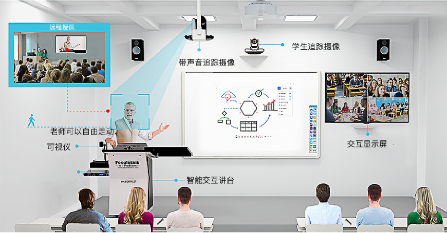在智慧教室里,教師和學(xué)生的電腦、移動終端里的學(xué)習(xí)資源,可通過Miracast和airplay等無線投屏神器實現(xiàn)共享;多部4K高清攝像頭,可自動跟蹤老師上課情況,對老師講授的內(nèi)容實行云錄播,學(xué)生可隨手“點播”錄播視頻,查看“回放”。借助智慧教室里的遠程交互系統(tǒng),還可輕松實現(xiàn)跨地區(qū)交互,實施遠程教學(xué)。