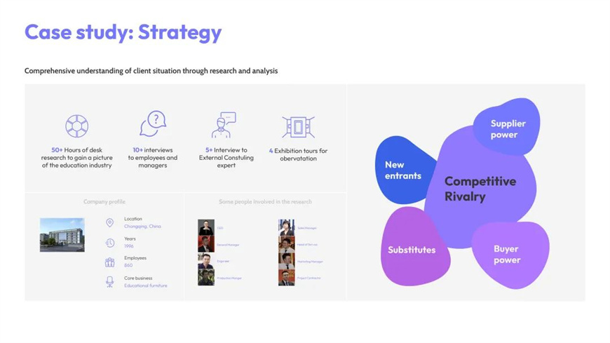 項(xiàng)目的第一步是戰(zhàn)略設(shè)計(jì),我們制定計(jì)劃全面研究和分析了解客戶的情況。這部分包括案頭研究,對(duì)公司主要部門管理人員和外部專家顧問的采訪,為了全面了解市場(chǎng)情況,我們同時(shí)分別調(diào)研了教育家具領(lǐng)域的多個(gè)重要的展會(huì)。隨后在“波特五力”“SWOT"等戰(zhàn)略模型中進(jìn)行綜合和分析。最終在與客戶討論后,我們確定了更具體的項(xiàng)目設(shè)計(jì)需求: