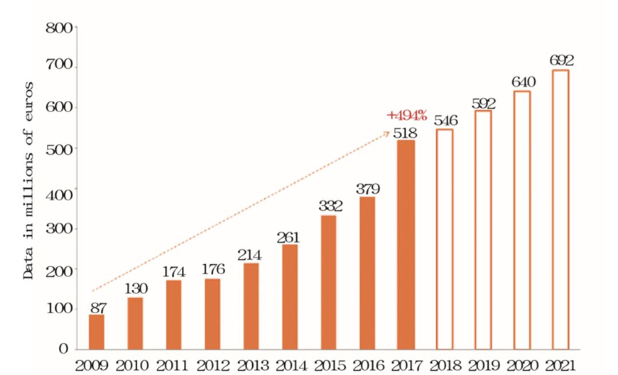 2009年起,意大利對中國的家具出口(家具和照明系統(tǒng))穩(wěn)定增長,2017年相比2009年增長了494%(圖1)。