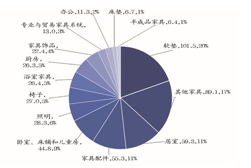 三大行業(yè)幾乎占對中國出口總額的一半:軟墊(我們是領(lǐng)先的供應(yīng)商),占比20%(1.015億歐元);其他家具(木制家具,不包括其他類別和其他材料制成的家具,如塑料、竹子、柳條或藤條),占總量的17%(8910萬歐元);及居室,共5930萬歐元(占總量的11%)。家具配件行業(yè)的表現(xiàn)最為穩(wěn)定,共計5530萬歐元(11%)(圖4)。
