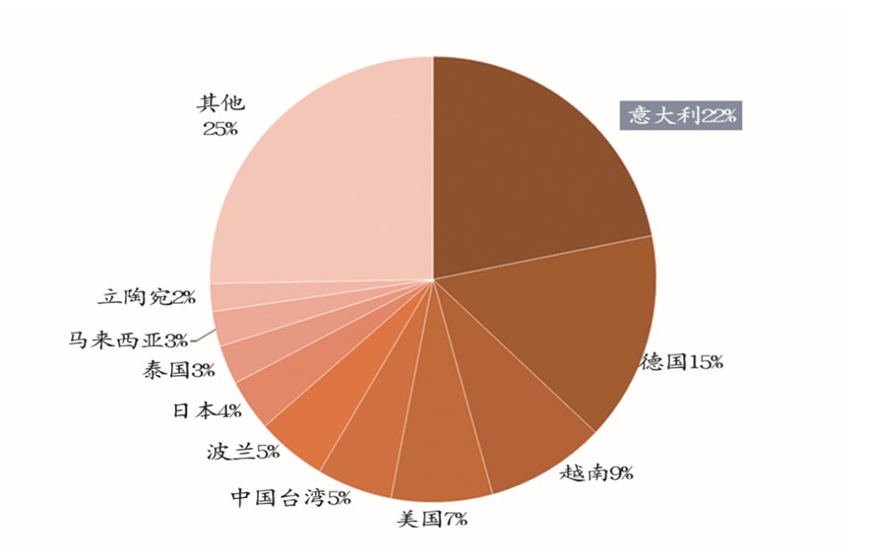 與競爭對手相比,意大利是家具銷售額最高的國家和地區(qū)(2017年占中國進(jìn)口總量的22%)。德國排名第二,占15%(圖5)。