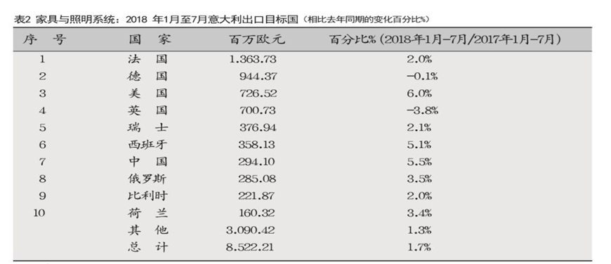 在2018年的前七個月,中國在意大利十大家具和照明出口目標(biāo)國中排名第七。2018年1月至7月,增速有所放緩(+5.5%),但仍是前十國家和地區(qū)中增長最快的(表2)。