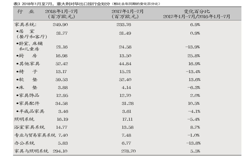 在2018年的前七個月,意大利出口增長主要受到軟墊(+13.6%)的推動,其次是其他家具(+16.9%)和家具配件(+10.5%)(表3)。